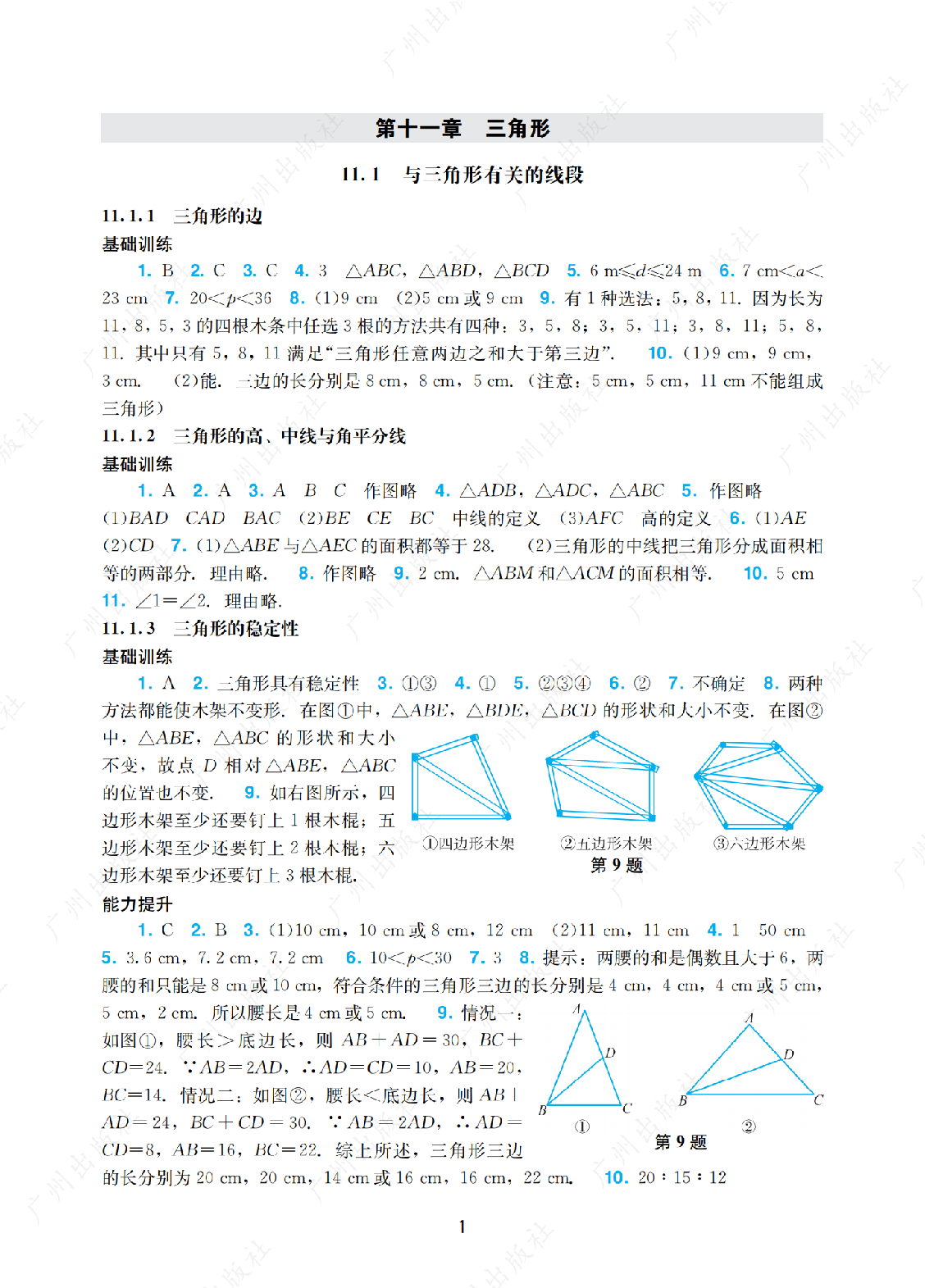 1.A 2.A 3.A BC 作图略 4.AADB,AADC,AABC 5.作图略(1)BAD CADBAC(2)BECEBC中线的定(3)AFC高的定义6.(1)AE(2)CD7.(1)ABE与AAEC的面积都等于28.(2)三角形的中线把三角形分成面积相等的两部分,理由略,8.作图略9.2cm,ABM和AACM的面积相等,10.5cm11./1=/2.理由略.