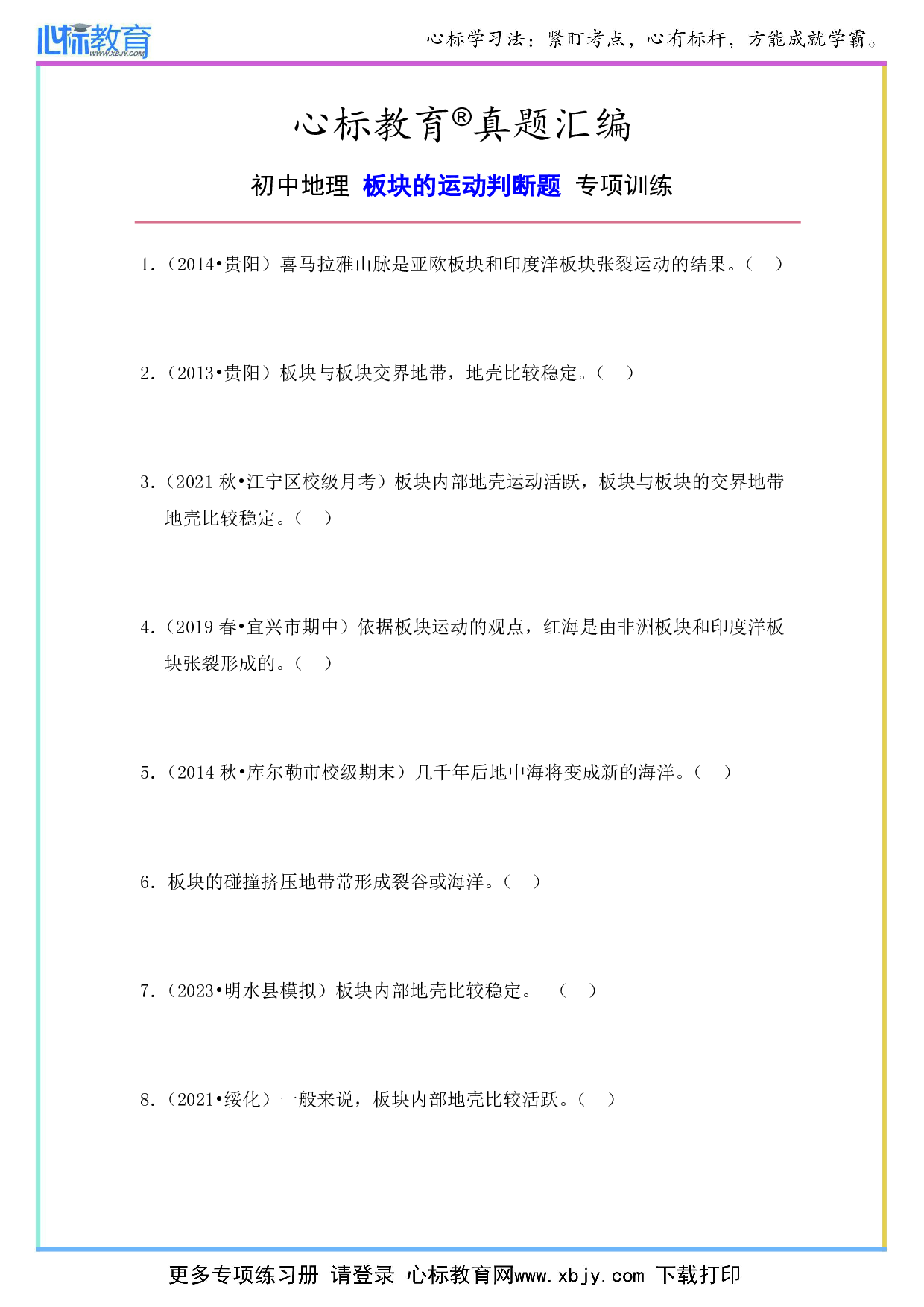 心标教育®真题汇编初中地理 板块的运动判断题 专项训练-406401073151.(2014•贵阳)喜马拉雅山脉是亚欧板块和印度洋板块张裂运动的结果。( ) 2.(2013•贵阳)板块与板块交界地带,地壳比较稳定。( ) 3.(2021秋•江宁区校级月考)板块内部地壳运动活跃,板块与板块的交界地带地壳比较稳定。( ) 4.(2019春•宜兴市期中)依据板块运动的观点,红海是由非洲板块和印度洋板块张裂形成的。( ) 5.(2014秋•库尔勒市校级期末)几千年后地中海将变成新的海洋。( ) 6.板块的碰撞挤压地带常形成裂谷或海洋。( ) 7.(2023•明水县模拟)板块内部地壳比较稳定。 ( ) 8.(2021•绥化)一般来说,板块内部地壳比较活跃。( ) 参考答案1.解:一般来说,板块的内部比较稳定,有的张裂拉伸,地壳比较活跃,喜马拉雅山是由于亚欧板块和印度洋板块碰撞挤压形成的.故答案为:×.2.解:海洋与陆地的相对位置是不断变化的。一般来说,板块与板块交界的地带,有的碰撞挤压。故答案为:×。3.解:板块构造学说认为,地球岩石圈是由板块拼合而成的,板块的内部比较稳定,多火山地震。故答案为:×。4.解:红海位于印度洋板块与非洲板块之间,因为印度洋板块和非洲板块正不断发生张裂运动,形成新的大洋。故答案为:√。5.解:地质学家经过长期研究,提出了板块构造学说,地球岩石圈是由板块拼合而成的,其中太平洋板块几乎全部是海洋,又包括海洋.一般来说,板块与板块交界的地带,有的碰撞挤压.根据测量以及板块构造学说,几千万年后.故答案为:×.6.解:板块发生张裂运动时,其运动方向相反,在张裂地区常形成裂谷或海洋,其方向是相对运动,地表还会不断隆起。故答案为:×。7.解:板块内部地壳比较稳定,少火山和地震,地壳活跃。故答案为:×。8.解:一般来说,板块内部地壳比较稳定,地壳比较活跃。故答案为:×。