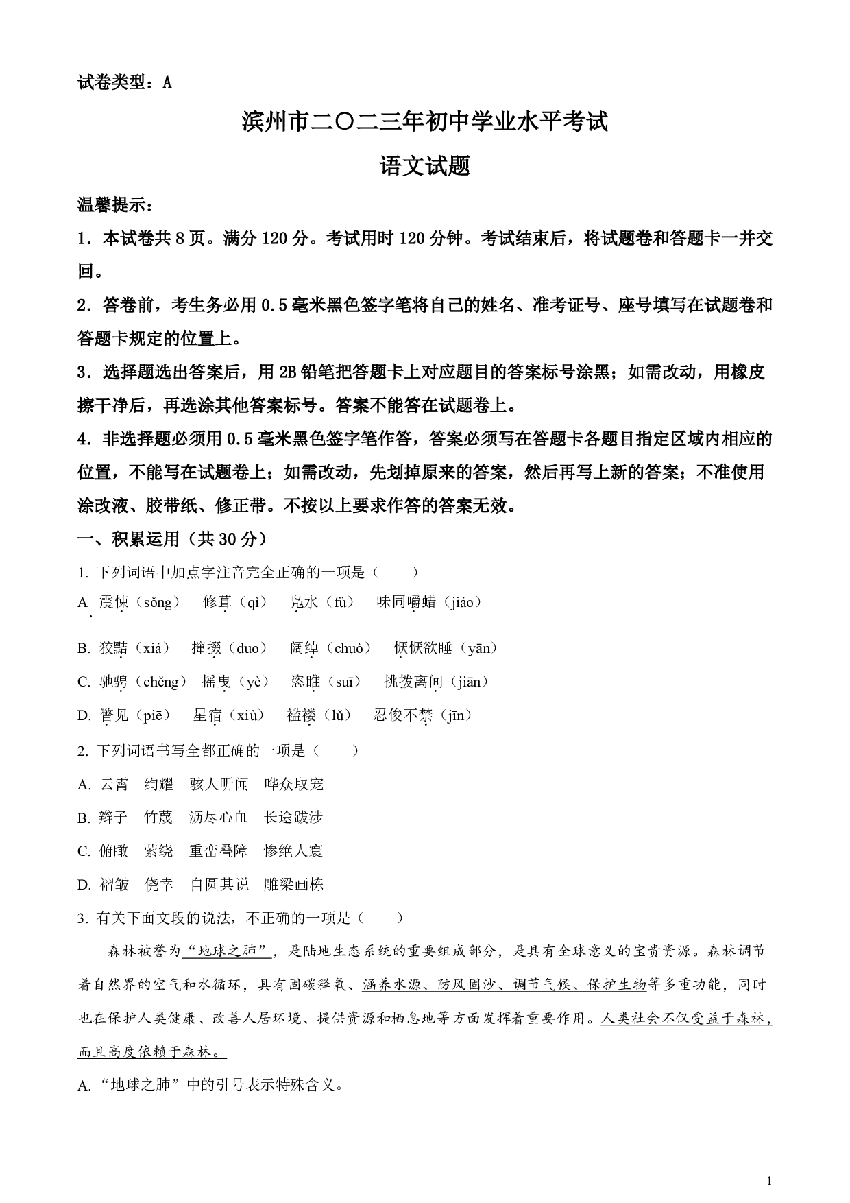 试卷类型:A滨州市二○二三年初中学业水平考试语文试题温馨提示:1.本试卷共8页。满分120分。考试用时120分钟。考试结束后,将试题卷和答题卡一并交回。2.答卷前,考生务必用0.5毫米黑色签字笔将自己的姓名、准考证号、座号填写在试题卷和答题卡规定的位置上。3.选择题选出答案后,用2B铅笔把答题卡上对应题目的答案标号涂黑;如需改动,用橡皮擦干净后,再选涂其他答案标号。答案不能答在试题卷上。4.非选择题必须用0.5毫米黑色签字笔作答,答案必须写在答题卡各题目指定区域内相应的位置,不能写在试题卷上;如需改动,先划掉原来的答案,然后再写上新的答案;不准使用涂改液、胶带纸、修正带。不按以上要求作答的答案无效。一、积累运用(共30分)1. 下列词语中加点字注音完全正确的一项是( )A 震悚(sǒng) 修葺(qì) 凫水(fù) 味同嚼蜡(jiáo)B. 狡黠(xiá) 撺掇(duo) 阔绰(chuò) 恹恹欲睡(yān)C. 驰骋(chěng) 摇曳(yè) 恣睢(suī) 挑拨离间(jiān)D. 瞥见(piē) 星宿(xiù) 褴褛(lǔ) 忍俊不禁(jīn)2. 下列词语书写全都正确的一项是( )A. 云霄 绚耀 骇人听闻 哗众取宠B. 辫子 竹蔑 沥尽心血 长途跋涉C. 俯瞰 萦绕 重峦叠障 惨绝人寰D. 褶皱 侥幸 自圆其说 雕梁画栋3. 有关下面文段的说法,不正确的一项是( )森林被誉为“地球之肺”,是陆地生态系统的重要组成部分,是具有全球意义的宝贵资源。森林调节着自然界的空气和水循环,具有固碳释氧、涵养水源、防风固沙、调节气候、保护生物等多重功能,同时也在保护人类健康、改善人居环境、提供资源和栖息地等方面发挥着重要作用。人类社会不仅受益于森林,而且高度依赖于森林。A. “地球之肺”中的引号表示特殊含义。B. “肺”字是左右结构,第五笔的笔画是横。C. “涵养水源、防风固沙、调节气候、保护生物”,这4个短语结构类型相同。D. “人类社会不仅受益于森林,而且高度依赖于森林。”这是递进关系的复句。4. 下面文段中有语病的一项是( )滨州依河傍海,古有“渤海雄邦”之称。(A)这里有126公里海岸线,94公里黄河穿城而过,渤海与黄河不仅造就了滨州开放包容的城市气质,也传承着滨州人重情重义的血脉基因。(B)滨州是一座底蕴丰厚的文化之城,是黄河文化、孙子文化、孝文化发祥地。梁邹范公传“忧乐”精神,惠民孙武著兵学圣典,博兴董永立仁孝典范。(C)滨州是一座风姿绰约的魅力之城,这里既有浪漫水乡的灵动和雅致,又有人间福地的秀美和神韵。沿黄生态风光绮丽,湿地公园秀美怡人。(D)黄河文化、孙子文化、孝文化,这些已经成为滨州发展最基本、最深沉、最持久的强大动力。A. AB. BC. CD. D5. 依次在横线处填入句子,衔接最恰当的一项是( )______。______。______。______。游园观景,如看中国画的长卷一样,次第接于眼帘,观之不尽。①这就是景物组合形成的不同空间感觉,有开朗、有收敛、有幽深、有明畅②还可利用长廊云墙、曲桥漏窗等,构成各种画面,使空间更加扩大,层次分明③因此,游过中国园林的人会感到庭园虽小,却曲折有致④中国园林,除山石树木外,建筑物的巧妙安排,十分重要,如花间隐榭、水边安亭A. ①③②④B. ①④②③C. ④②③①D. ④②①③6. 下列关于文学、文化常识的表述,不正确的一项是( )A. 苏轼,字子瞻,号东坡居士,北宋文学家,豪放派词人代表。我们在初中课本上学过他的《记承天寺夜游》《江城子·密州出猎》《卜算子·咏梅》《水调歌头》《定风波》。B. “说”是古代一种议论性文体,大多是就一事、一物或一种现象抒发作者的感想,写法上不拘一格,行文崇尚自由活泼。如周敦颐的《爱莲说》和韩愈的《马说》。C. 古代常用的敬辞和谦辞如今仍在广泛使用,例如请教他人时常说“赐教”,询问别人的年龄时常说“贵庚”,发表自己的见解时常说“拙见”。D. 律诗是近体诗的一种,要求诗句字数整齐划一,每句五个字或七个字,简称“五律”或“七律”。通常的律诗规定每首八句,每两句成一联,分为首联、颔联、颈联、尾联。7. 默写。(1)读史使人明智,______,数学使人周密。(弗朗西斯·培根《谈读书》)(2)大漠孤烟直,______。(王维《使至塞上》)(3)______,关山度若飞。(《木兰诗》)(4)长风破浪会有时,______。(李白《行路难(其一)》)(5)复行数十步,______。(陶渊明《桃花源记》)(6)______,再而衰,三而竭。(《曹刿论战》)(7)王勃《送杜少府之任蜀州》中“______,______”一扫离别的千古愁云,给人以积极向上的力量,成为历代传唱的名句。(8)我们学习不仅要做到学思结合,正如《论语》中所写的“ ______,思而不学则殆”,还要像《送东阳马生序》中宋濂那样“______”多向有道德有学问的前辈请教。名著阅读。(4分)8. 关于这种惊人的征战,将来有一日会有人写成全部的叙事诗的。这种征战,即使把政治和战事除掉,也是近代历史中,青年们的一种动人的成就。可是我暂时必须要继续我的故事,因为我们已经把红军会合在西北了。现在我把毛泽东主席所写的一首诗,拿来当作结束,这位指挥者既能领导远征,同时又写得一手好诗。红军不怕远征难,万水千山只等闲。五岭逶迤腾细浪,乌蒙磅礴走泥丸。金沙水拍云崖暖,大渡桥横铁索寒。更喜岷山千里雪,三军过后尽开颜。(1)以上文段选自《______》,文中的“我”是指______(人名)。(2)学校正在开展“阅读·正青春”专题研讨会,请参与探究,分享你的发现。【阅