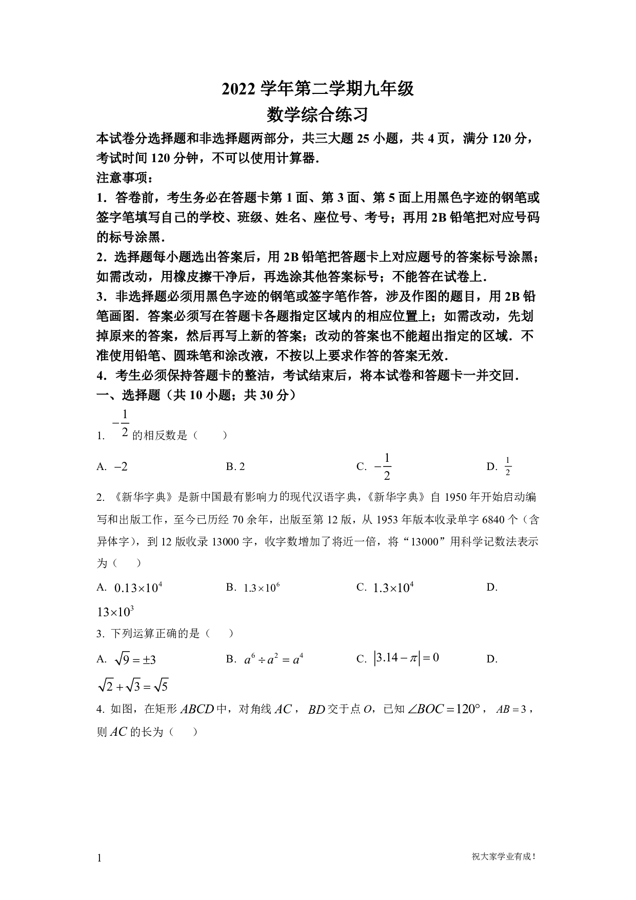 2022学年第二学期九年级数学综合练习本试卷分选择题和非选择题两部分,共三大题25小题,共4页,满分120分,考试时间120分钟,不可以使用计算器.注意事项:1.答卷前,考生务必在答题卡第1面、第3面、第5面上用黑色字迹的钢笔或签字笔填写自己的学校、班级、姓名、座位号、考号;再用2B铅笔把对应号码的标号涂黑.2.选择题每小题选出答案后,用2B铅笔把答题卡上对应题号的答案标号涂黑;如需改动,用橡皮擦干净后,再选涂其他答案标号;不能答在试卷上.3.非选择题必须用黑色字迹的钢笔或签字笔作答,涉及作图的题目,用2B铅笔画图.答案必须写在答题卡各题指定区域内的相应位置上;如需改动,先划掉原来的答案,然后再写上新的答案;改动的答案也不能超出指定的区域.不准使用铅笔、圆珠笔和涂改液,不按以上要求作答的答案无效.4.考生必须保持答题卡的整洁,考试结束后,将本试卷和答题卡一并交回.一、选择题(共10小题;共30分)1. false的相反数是( )A. falseB. 2C. falseD. false2. 《新华字典》是新中国最有影响力现代汉语字典,《新华字典》自1950年开始启动编写和出版工作,至今已历经70余年,出版至第12版,从1953年版本收录单字6840个(含异体字),到12版收录13000字,收字数增加了将近一倍,将“13000”用科学记数法表示为( )A. falseB. falseC. falseD. false3. 下列运算正确的是( )A. falseB. falseC. falseD. false4. 如图,在矩形false中,对角线false,false交于点O,已知false,false,则false的长为( )A. falseB. falseC. falseD. false5. false是false的角平分线,若false,false,则点false到false距离为( )A. falseB. falseC. falseD. false6. 如图,数轴上的点false可以用实数false表示,下面式子成立的是( )A. falseB. falseC. falseD. false7. 某校为了了解本校学生课外阅读的情况,现随机抽取了部分学生,对他们一周的课外阅读时间进行了调查,并绘制出如下统计图,根据相关信息,下列有关课外阅读时间(单位:小时)的选项中,错误的是( )A. 本次抽取共调查了40个学生B. 中位数是6小时C. 众数5小时D. 平均数是false小时8. 若点false,false,false在反比例函数的图象false上,则false、false、false的大小关系是( )A. falseB. falseC. falseD. false9. 《九章算术》中有一道题的条件是:“今有大器五小器一容三斛,大器一小器五容二斛.”大致意思是:有大小两种盛米的桶,5大桶加1小桶共盛3斛米,1大桶加5小桶共盛2斛米,依据该条件,求1个大桶和1个小桶分别可以盛多少斛米?设1个大桶盛false斛米,1个小桶盛false斛米.可列方程组( )A. falseB. falseC. falseD. false10. 已知二次函数false,false与自变量false之间的部分对应值如下表所示.下列结论:①false;当②false时,false;③false;④关于false的一元二次方程false的解是false,false.其中正确的有( )x…falsefalsefalsefalse…y…falsefalse10…A. 1个B. 2个C. 3个D. 4个二、填空题(共6小题;共18分)11. 分解因式false_______.12. 已知:如图,点false在边false上,若false______时,则false.13. 如图,把一个直角三角尺的直角顶点放在直尺的一边上,若false,则false_______.14. 若关于false的一元二次方程false的一个根为false.则false_______.15. 若直线false和false相交于点false,则关于false的不等式false的解集是_______.16. 如图,点false为等边三角形false边false上一动点,false,连接false,以false为边作正方形false,连接false、false,则当false________时,false的面积为最小值________.三、解答题(共7小题;共72分)17. 解不等式组:false18 如图,false中,false,求证:false.19. 已知:false(1)化简false;(2)如图,false、false分别为圆锥的底面半径和母线的长度,若圆锥侧面积为false,求false的值.20. 梅雨季节来临,某电器店开始销售A、B两种型号的便携式小型除湿器,B型除湿器每台价格是A型除湿器的1.5倍.销售若干周后,A型除湿器总销售额为20000元,B型除湿器销售额为45000元,其中B型除湿器比A型除湿器多销售50台.求A型号的除湿器每台价格是多少元?21. 为锻炼学生的社会实践能力,某校开展五项社会实践活动,要求每名学生在规定时间内必须且只能参加其中一项活动,该校从全体学生中调查他们参加活动的意向,将收集的数据整理后,绘制成如下两幅不完整的统计图(五个综合实践活动分别用false表示):(1)扇形统计图中的false________false,false项活动所在扇形的圆心角的大小是________false.(2)甲同学想参加false、false、false三个活动中的一个,乙同学想参加false、false、false这三个活动中的一个,若他们随机抽选其中一个活动的概率相同,请用列表法或画树状图法,求他们同时选中同一个活动的概率.22. 如图,false中,false,false,false绕点false顺时针旋转与false重合,点false在false轴上,连接false,若反比例函数false与直线false仅有一个公共点false(1)求直线false和反比例函数false的解析式;(2)把false沿直线false翻折到false,false与反比例函数交于点false,求false的面积.23. 已知:false中,false,false(1)尺规作图:求作false的中点false,连false并延长,交false于点false(保留作图痕迹,不写作法)(2)从条件①、条件②这两个条件中选择一个作为已知条件,求false的余弦值.条件①:false和false面积为false和false,且false;条件②:false和false的周长为false和false,且false.注:如果选择条件①和条件②分别作答,按第一个解答计分.24. 如图1,false中,false,false边上找一点false,以false为半径作圆.分别交false,false于点false,false.false是false的切线.且false,false,(1)证明:false(2)求false的面积;(3)如图2,过点false作false的平行线交false点于点false,false为劣弧false
