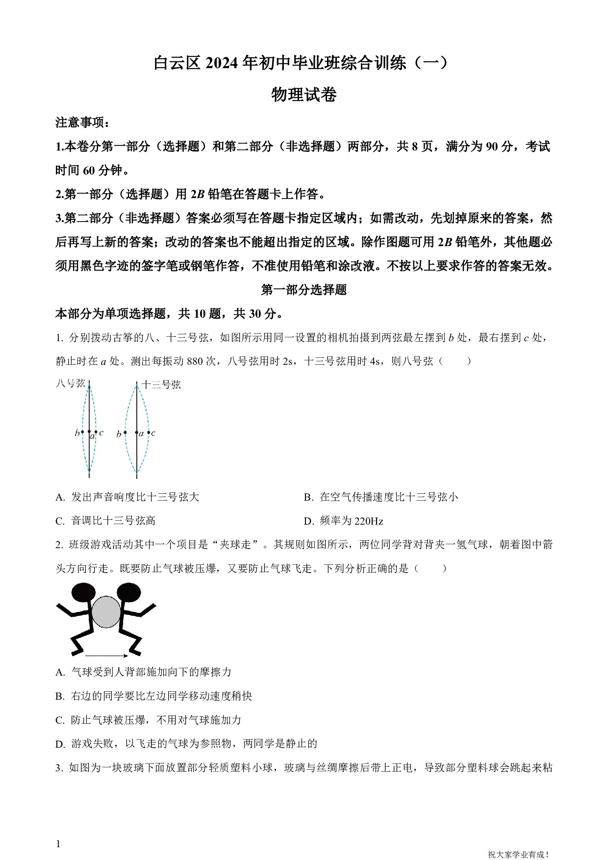 白云区2024年初中毕业班综合训练(一)物理试卷注意事项:1.本卷分第一部分(选择题)和第二部分(非选择题)两部分,共8页,满分为90分,考试时间60分钟。2.第一部分(选择题)用2B铅笔在答题卡上作答。3.第二部分(非选择题)答案必须写在答题卡指定区域内;如需改动,先划掉原来的答案,然后再写上新的答案;改动的答案也不能超出指定的区域。除作图题可用2B铅笔外,其他题必须用黑色字迹的签字笔或钢笔作答,不准使用铅笔和涂改液。不按以上要求作答的答案无效。第一部分选择题本部分为单项选择题,共10题,共30分。1. 分别拨动古筝的八、十三号弦,如图所示用同一设置的相机拍摄到两弦最左摆到b处,最右摆到c处,静止时在a处。测出每振动880次,八号弦用时2s,十三号弦用时4s,则八号弦( )A. 发出声音响度比十三号弦大B. 在空气传播速度比十三号弦小C. 音调比十三号弦高D. 频率为220Hz2. 班级游戏活动其中一个项目是“夹球走”。其规则如图所示,两位同学背对背夹一氢气球,朝着图中箭头方向行走。既要防止气球被压爆,又要防止气球飞走。下列分析正确的是( )A. 气球受到人背部施加向下的摩擦力B. 右边的同学要比左边同学移动速度稍快C. 防止气球被压爆,不用对气球施加力D. 游戏失败,以飞走的气球为参照物,两同学是静止的3. 如图为一块玻璃下面放置部分轻质塑料小球,玻璃与丝绸摩擦后带上正电,导致部分塑料球会跳起来粘住玻璃,下列说法正确的是( )A. 塑料球一定是带负电的B. 丝绸摩擦玻璃时,玻璃得到了电子C. 塑料球粘在玻璃上说明分子间有引力D. 塑料球被吸引可能是带电体吸引轻小物体4. 烙饼是大家喜爱的主要面食之一。其做法是:将发酵好的面团揉一会儿,整形成厚薄均匀的饼胚,再烤制。如图所示四个面团变成一张饼胚,对桌面的( )A. 压力不变B. 压强不变C. 压力变小D. 饼胚单位面积对桌面压力变大5. 在光具座A点处放置一发光物体,从焦距f甲为5厘米、f乙为10厘米、f丙为20厘米的凸透镜中选择一个放置在如图所示的位置,在BC间移动光屏时可在光屏上得到清晰的像,则选择的凸透镜为 A. 甲B. 乙C. 甲、乙D. 乙、丙6. 如图所示是一个三孔插线板,其中插座是否通电由开关控制,并由指示灯显示开关是否闭合,则下面的电路图与该插线板内部电路一致的是(其中L表示火线,N表示零线)( ) A B. C. D. 7. 将小灯泡L₁和L2接入电路,测得电流如图所示,下列说法正确的是( )A. L1两端电压比L2大B. L1电流做功比L2快C. L1的实际功率比L2小D. L1发光时电阻比L2大8. 如图所示,导线a、b通电前固定不动,已知通电后左磁体对a的作用力的方向为水平向右(在图中已正确标出F1)。判断在图中标注力F2、F3、F4的方向。哪个标注是正确的( )A. 只有F2正确B. 只有F3正确C F2、F3都不正确D. F2、F4正确9. 质量相同甲、乙两个小球,自由下落经过如图所示的位置时机械能相等,不考虑空气阻力。下列说法正确的是( )A. 此时甲、乙两球的动能相等B. 此时甲、乙两球的重力势能相等C. 两球在落地前的速度相等D. 两球下落的初始位置的高度不同10. 两个质量相同的均匀实心小球甲、乙false放入装有水的烧杯中,已知甲受到的浮力较大,则两球静止在水中时的情形可能是图中的( )A. B. C. D. 第二部分 非选择题本部分共8题,共60分。按题目要求作答。11. 如图所示,水池边有一路灯S,路灯上方有一平面镜false,S发出的光能经false反射后射入水中,请画出:(1)S在平面镜中所成的像false;(2)经false反射后过A点的反射光线false;(3)false照射到水池底的光路图。12. 同学们在体育课上做仰卧起坐,前半段是背部由平躺地面变成脊柱弯曲,后半段是上半身完全离开地面。(1)仰卧起坐时,人体可看成杠杆模型,O为支点,肌肉的拉力F为动力。如图所示,请画出杠杆模型的阻力臂l。______(2)先将头向前抬起,可以减小______力臂。在平躺至坐起的过程中,运动员肌肉所施加的动力变化是______(选填“变小”、“不变”或“变大”)。(3)同学们可以改变仰卧起坐的快慢,来控制体育锻炼的效果,从物理学角度分析,其实质是改变______的大小(填一最优选项符号)。A.机械效率 B.速度 C.功率13. 如图是为宇航员设计的“太空圆珠笔”,墨水靠密封笔管内的压缩氮气推动活塞向外挤出。(1)笔管内压缩氮气的气压______周围环境的气压(选填“大于”“等于”或“小于”);(2)墨水向外挤出的过程中,密封压缩氮气的密度______(选填“变大”“变小”或“不变”),判断依据是______;(3)氮气在一定条件下能______(填物态变化名称)成液态氮。当液态氮暴露在30℃的环境中(此时液态氮的沸点为false),能观察到液态氮在不断沸腾,一段时间周边气温降至0℃,那么此时液态氮的温度等于______℃(填一温度值)。14. 温度不同的两物体接触时,低温物体吸热false,高温物体放热false,忽略热散失,false(1)将质量相等的铜块和铝块放入冰箱,使它们的温度降低到0℃;(2)取出后,将铜块、铝块再分别放入盛有质量相等、温度都是23℃的水中,如图所示,并将容器用隔热材料密封(如图);(3)一段时间后温度稳定,同时测量甲、乙两容器中水的温度,分别是20℃和17℃;(4)对比数据可判断,(以下两空均选填“铝”或“铜”)______的温度变化大。______从水中吸收的热量多,判断的依据是______。15. 食品厂配制了两种不同密度的盐水来挑选榛子果仁。在甲、乙两个完全相同的杯子中倒入体积相等、密度不同的盐水。