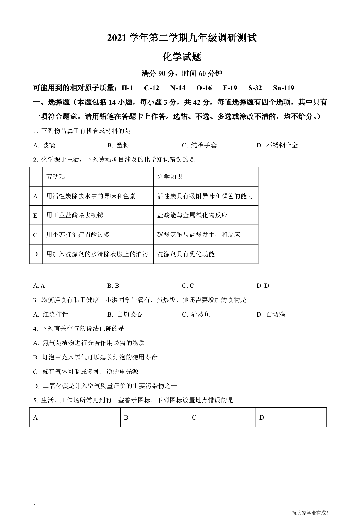 2021学年第二学期九年级调研测试化学试题满分90分,时间60分钟可能用到的相对原子质量:H-1 C-12 N-14 O-16 F-19 S-32 Sn-119一、选择题(本题包括14小题,每小题3分,共42分,每道选择题有四个选项,其中只有一项符合题意。请用铅笔在答题卡上作答。选错、不选、多选或涂改不清的,均不给分。)1. 下列物品属于有机合成材料的是A. 玻璃B. 塑料C. 纯棉手套D. 不锈钢合金2. 化学源于生活,下列劳动项目涉及的化学知识错误的是劳动项目化学知识A用活性炭除去水中的异味和色素活性炭具有吸附异味和颜色的能力E用工业盐酸除去铁锈盐酸能与金属氧化物反应C用小苏打治疗胃酸过多碳酸氢钠与盐酸发生中和反应D用加入洗涤剂的水清除衣服上的油污洗涤剂具有乳化功能A. AB. BC. CD. D3. 均衡膳食有助于健康。小洪同学午餐有、蛋炒饭,他还需要增加的食物是A. 红烧排骨B. 白灼菜心C. 清蒸鱼D. 白切鸡4. 下列有关空气说法正确的是A. 氮气是植物进行光合作用必需的物质B. 灯泡中充入氧气可以延长灯泡的使用寿命C. 稀有气体可制成多种用途的电光源D. 二氧化碳是计入空气质量评价的主要污染物之一5. 生活、工作场所常见到的一些警示图标。下列图标放置地点错误的是ABCD存放浓硫酸的柜子加油站饭堂洗手池存放酒精的柜子A. AB. BC. CD. D6. 合成氨是人类科学技术上的一项重大突破,对社会发展与科技进步做出了巨大贡献,合成氨工艺的主要流程如图上述流程各环节主要通过化学变化实现的是A. 合成塔B. 水冷器C. 氨分离器D. 循环气体7. 下列物质鉴别的方法错误的是选项鉴别的物质所加试剂与操作方法A硫酸铵和氯化铵取少量加熟石灰研磨,闻气味B羊毛和涤纶取少量灼烧,闻气味C氢氧化钾和硫酸钠取少量溶解,加氯化钡溶液,观察现象D氧气和二氧化碳伸入燃着的木条,观察现象A. AB. BC. CD. D8. 化学工业生产硫酸过程中的某一步反应用微观模型图表示如下,下列说法正确的是 A. 该反应是置换反应B. 该反应生成了三氧化硫和氧气C. 该反应中两种生成物的个数比是2:1D. 该反应中两种反应物的质量比为4:19. 下列关于碳和碳的氧化物说法正确的是A. CO2和CO均由碳元素和氧元素组成B. C、CO和CO2都有还原性C. 1 gC和1 g CO充分燃烧所需的氧气质量相同D. 金刚石和石墨的硬度都很大10. 第24届北京冬奥会的冰上运动场馆外墙铺设新型塑料[聚氟乙烯[(C2H3F)n,n为正整数]。下列关于聚氟乙烯的说法正确的是A. 碳元素的质量分数是:falseB. 相对分子质量是falsegC. 碳元素与氢元素的质量比为24:3D. 完全燃烧只生成水11. 根据图中提供的信息,下列说法错误的是A. 氯属于非金属元素,镉属于金属元素B. 每一个镉原子中含有48个质子C. 氯原子在化学反应中易获得1个电子D. 镉与氯可形成化合物CdCl12. “2015年和2020年我国新增电力装机结构对比”如图所示。下列说法错误的是A. 风能、太阳能、水能都属于可再生能源B. 对比2015年和2020年,太阳能和风能占比增大C. 可再生能源的利用,可以部分解决化石能源面临耗尽的问题D. 加大化石燃料的开采使用,有利于实现“碳中和”13. 取10℃,100 g水于烧杯中,按下图所示流程进行实验(实验过程中溶剂损失忽略不计),下列说法错误的是A. 乙溶液和丁溶液一定是不饱和溶液B. 甲→乙→丙,硝酸钾的溶解度变大C. 丙溶液中溶质与溶剂的质量比约为22:100D. 溶液中溶质质量分数的大小关系为丁>丙>乙14. 由下列实验及现象可推出相应结论的是选项实验现象结论A向灼热的氧化铜粉末中通入氢气 固体变为红色氢气具有可燃性B向待测固体中滴加稀盐酸 有气泡冒出该固体中含有碳酸根离子C向装有一定量水的烧杯中加入硝酸铵,观察温度计的变化 固体逐渐消失,温度计示数下降硝酸铵溶于水吸收热量D向装有二氧化碳的塑料瓶中加入约false水,迅速盖紧瓶盖。 塑料瓶变瘪二氧化碳与水反应生成碳酸A. AB. BC. CD. D二、非选择题(本题包括6小题,共48分)15. 阅读下列文字材料并回答问题。材料一:绿色化学的理念是使污染消除在产生的源头,不再使用有毒、有害的物质,不再产生废物,这是从根本上消除污染的对策,过程和终端均为零排放或零污染。世界上很多国家已把“化学的绿色化”作为新世纪化学发展的主要方向之一。材料二:新能源汽车已经走进我们的生活,与传统汽车的燃料来源于化石燃料不同。新能源汽车的能量来源更加多元化,如氢内燃车以氢气为燃料,不排放任何污染物。乙醇汽车以乙醇为燃料,燃烧时生成水和二氧化碳。乙醇(C2H5OH)是可再生能源,可通过发酵甘蔗、玉米等农作物或粮食收制后制金的称秆大量制取。我国新能源汽车发展迅速,未来可期。(1)乙醇溶液不能导电,其原因是乙醇是以______(填“分子”、“原子”或“离子”)的形式存在于溶液中。(2)乙醇在氧气中充分燃烧的化学方程式是:______。(3)充分燃烧1 kg乙醇可产生CO2的质量为______kg(精确到0.1)。充分燃烧1 kg汽油、1 kg煤所产生的CO2气体的质量如上图所示,因此用______(填“乙醇”、“煤”或“汽油”)为燃料更低碳环保。16. 锡(Sn)是我们应用较早的金属,可用来制造马口铁(镀锡铁)、青铜等。(1)焊锡是锡和铅的合金,焊锡的熔点比锡的熔点______(填“高”或“低”)。(2)明代宋应星所著的《天工开物》中记载过炼锡的方法:以二氧化锡SnO2)和木炭粉为原料在高温下反应制得金属锡和一种可燃性的气体,写出该反应的化学方程