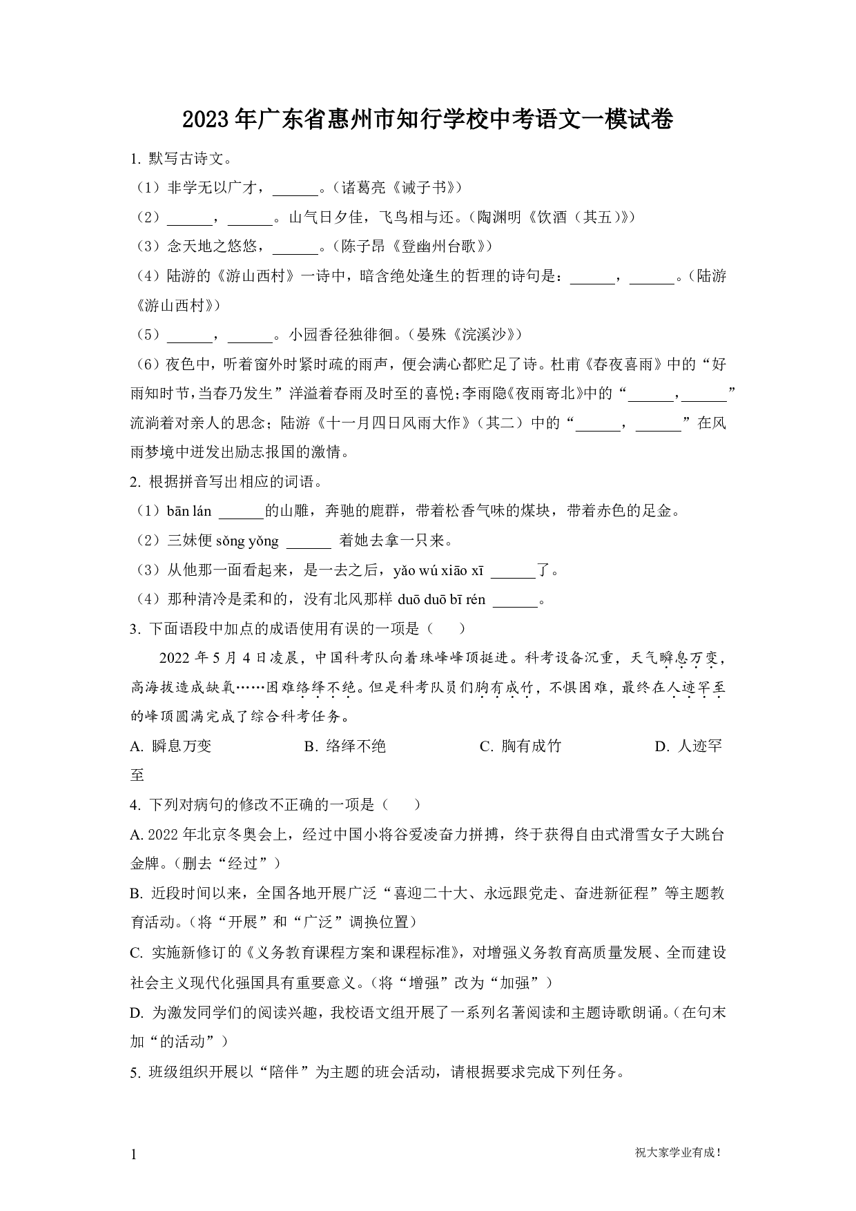 2023年广东省惠州市知行学校中考语文一模试卷1. 默写古诗文。(1)非学无以广才,______。(诸葛亮《诫子书》)(2)______,______。山气日夕佳,飞鸟相与还。(陶渊明《饮酒(其五)》)(3)念天地之悠悠,______。(陈子昂《登幽州台歌》)(4)陆游的《游山西村》一诗中,暗含绝处逢生的哲理的诗句是:______,______。(陆游《游山西村》)(5)______,______。小园香径独徘徊。(晏殊《浣溪沙》)(6)夜色中,听着窗外时紧时疏的雨声,便会满心都贮足了诗。杜甫《春夜喜雨》中的“好雨知时节,当春乃发生”洋溢着春雨及时至的喜悦;李雨隐《夜雨寄北》中的“______,______”流淌着对亲人的思念;陆游《十一月四日风雨大作》(其二)中的“______,______”在风雨梦境中迸发出励志报国的激情。2. 根据拼音写出相应的词语。(1)bān lán ______的山雕,奔驰的鹿群,带着松香气味的煤块,带着赤色的足金。(2)三妹便sǒng yǒng ______ 着她去拿一只来。(3)从他那一面看起来,是一去之后,yǎo wú xiāo xī ______了。(4)那种清冷是柔和的,没有北风那样duō duō bī rén ______。3. 下面语段中加点的成语使用有误的一项是( )2022年5月4日凌晨,中国科考队向着珠峰峰顶挺进。科考设备沉重,天气瞬息万变,高海拔造成缺氧……困难络绎不绝。但是科考队员们胸有成竹,不惧困难,最终在人迹罕至的峰顶圆满完成了综合科考任务。A. 瞬息万变B. 络绎不绝C. 胸有成竹D. 人迹罕至4. 下列对病句的修改不正确的一项是( )A. 2022年北京冬奥会上,经过中国小将谷爱凌奋力拼搏,终于获得自由式滑雪女子大跳台金牌。(删去“经过”)B. 近段时间以来,全国各地开展广泛“喜迎二十大、永远跟党走、奋进新征程”等主题教育活动。(将“开展”和“广泛”调换位置)C. 实施新修订《义务教育课程方案和课程标准》,对增强义务教育高质量发展、全而建设社会主义现代化强国具有重要意义。(将“增强”改为“加强”)D. 为激发同学们的阅读兴趣,我校语文组开展了一系列名著阅读和主题诗歌朗诵。(在句末加“的活动”)5. 班级组织开展以“陪伴”为主题班会活动,请根据要求完成下列任务。(1)【活动一:品味诗词,明确主题】陪伴不仅仅是陪在身边,亦是心与心相连,对彼此的真心祝愿。下列选项中,不符合班会主题的一项是( )A. 但愿人长久,千里共婵娟。B. 莫愁前路无知己,天下谁人不识君。C. 若到江南赶上春,千万和春住。D. 仍怜故乡水,万里送行舟。(2)【活动二:推荐书目,共同参与】在我们读过的名著中,能体现出“陪伴”的有很多,请你把下面的表格补充完整。名著人物情节《简·爱》①耐心倾听简·爱的辩护,认定简·爱是无辜的《朝花夕拾》阿长(长妈妈)②③在异国他乡给鲁迅以温暖,帮鲁迅修改讲义(3)【活动三:陪伴升级,人物推荐】你所在的班级正在开展“平凡人物身上的高尚情操”候选人推荐活动,请从(2)题两部名著中推荐一位候选人。并结合名著内容写出推荐理由。(4)【活动四:会后座谈,加深感受】班主任组织同学们分享参加此次活动的感受,以下是小西同学的发言,请你将其补充完整。当你失落的时候,陪伴是一颗甜甜的糖果;当你伤心的时候,陪伴是一首暖心的歌曲:______,______。正是有了陪伴,我们才化解了痛苦与哀愁。6. 阅读文言文,完成问题。【甲】太行、王屋二山,方七百里,高万仞,本在冀州之南,河阳之北。北山愚公者,年且九十,面山而居。 惩山北之塞,出入之迂也,聚室而谋曰:“吾与汝毕力平险,指通豫南,达于汉阴,可乎?”杂然相许,其妻献疑曰:“以君之力,曾不能损魁父之丘,如太行、王屋何?且焉置土石?”杂白:“投诸渤海之尾,隐土之北。”遂率子孙荷担者三夫,叩石垦壤,箕畚运于渤海之尾。邻人京城氏之孀妻有遗男,始龀,跳往助之。寒暑易节,始一反焉。河曲智叟笑而止之曰:“甚矣,汝之不惠!以残年余力,曾不能毁山之一毛,其如土石何?”北山愚公长息曰:“汝心之固,固不可彻,曾不若孀妻弱子。虽我之死,有子存焉。子又生孙,孙又生子;子又有子,子又有孙;子子孙孙无穷匮也,而山不加增,何苦而不平?”河曲智叟亡以应。操蛇之神闻之,惧其不已也,告之于帝。帝感其诚,命夸娥氏二子负二山,一厝朔东,一厝雍南。自此,冀之南,汉之阴,无陇断焉。【乙】予少时读书一见辄能诵暗疏①之亦不甚失。然负此自放,喜从滑稽②饮酒者游,句朔③之间,把卷无几日。故虽有强记之力,而常废于不勤。比数年来,颇发愤,自惩艾④,悔前所为;而聪明⑤褒耗,殆不如曩时十一二。每阅一事,必寻绎败终⑥,掩卷茫然,辄复不省。故虽有勤苦之劳,而常废于善忘。嗟夫!敢吾业者,常此二物也。(节选自秦观《精骑集序》)【注释】①暗疏:默写。②滑稽:诙谐戏谑。③句朔:十日曰旬,每日初一曰朔。这里指一个月。④惩艾:惩戒。⑤聪明:听力和视力。⑥寻绎数终:从头到尾翻寻几次。(1)解释文中加点词语的意思。①且焉置土石②汝心之固,固不可彻③汝之不惠(2)把文中画线的句子翻译成现代汉语。①子子孙孙无穷匮也,而山不加增,何苦而不平?②惩山北之塞,出入之迂也。(3)解释文中,加点词语意思。①然负此自放②殆不如曩时十一二(4)请用“/”给文中画线的句子断句。予少时读书一见辄能谛暗疏之亦不甚失(5)请结合愚公移山精神,对【乙】文中的人物进行劝勉。7. 阅读短文,完成问题。成功属于求进者①福建长汀,曾是我国南方红壤区水土流失最严重的地