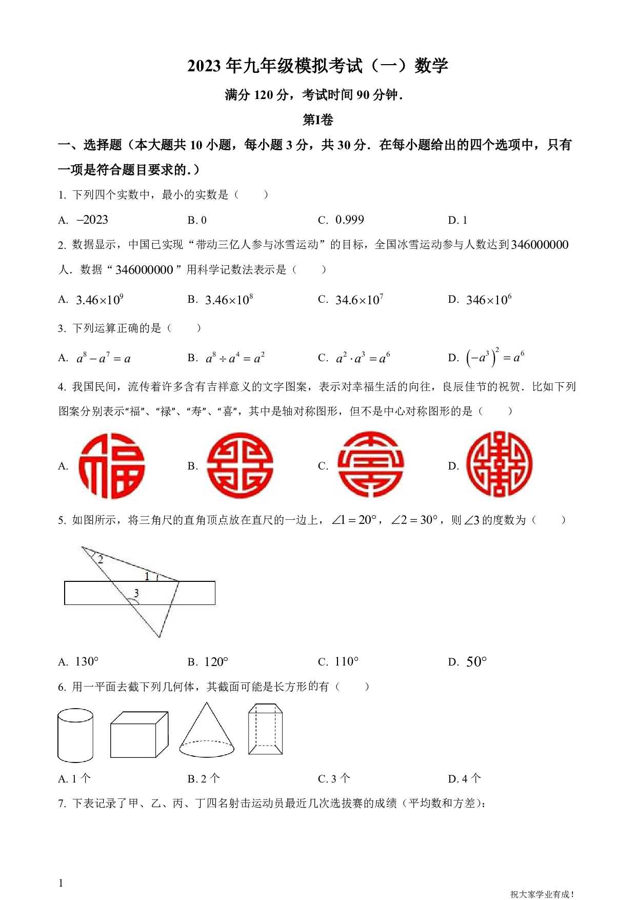 2023年九年级模拟考试(一)数学满分120分,考试时间90分钟.第Ⅰ卷一、选择题(本大题共10小题,每小题3分,共30分.在每小题给出的四个选项中,只有一项是符合题目要求的.)1. 下列四个实数中,最小的实数是( )A. falseB. 0C. false D. 12. 数据显示,中国已实现“带动三亿人参与冰雪运动”的目标,全国冰雪运动参与人数达到false人.数据“false”用科学记数法表示是( )A. falseB. falseC. falseD. false3. 下列运算正确的是( )A. falseB. falseC. falseD. false4. 我国民间,流传着许多含有吉祥意义的文字图案,表示对幸福生活的向往,良辰佳节的祝贺.比如下列图案分别表示“福”、“禄”、“寿”、“喜”,其中是轴对称图形,但不是中心对称图形的是( )A. B. C. D. 5. 如图所示,将三角尺的直角顶点放在直尺的一边上,false,false,则false的度数为( )A. falseB. falseC. falseD. false6. 用一平面去截下列几何体,其截面可能是长方形有( )A. 1个B. 2个C. 3个D. 4个7. 下表记录了甲、乙、丙、丁四名射击运动员最近几次选拔赛的成绩(平均数和方差):选手成绩甲乙丙丁平均数(环)falsefalsefalsefalse方差falsefalsefalsefalse 根据表中数据,要从中选择一名成绩好且发挥稳定的运动员参加比赛,则选择______较适宜;( )A. 甲B. 乙C. 丙D. 丁8. 某环保知识竞赛一共有20道题,规定:答对一道题得5分,答错或不答一道题扣1分.在这次竞赛中,小明被评优秀(85分或85分以上),则小明至少答对了______道题.( )A. 17B. 18C. 19D. 169. 如图,四边形false为⊙false的内接四边形,若四边形false为菱形,false为( ).A 45°B. 60°C. 72°D. 36°10. 已知抛物线false的对称轴是直线false,其部分图象如图所示,下列说法中:①false;②false;③若false、false是抛物线上的两点,则有false;④若m,nfalse为方程false的两个根,则false且false;以上说法正确的有( )A. ①②③④B. ②③④C. ②④D. ②③第Ⅱ卷二、填空题(本大题5小题,每小题3分,共15分.把正确答案填在答题卡上)11. 因式分解:false______.12. 若两个相似三角形的相似比为false,则它们的面积比是______.13. 若实数m,n满足false,则false的值是______;14. 如图,创新小组要测量公园内一棵树AB的高度,其中一名小组成员站在距离树10米的点E处,测得树顶A的仰角为45°,已知测角仪的架高CE=1.2米,则这棵树的高度为______米.15. 如图所示,等边false的边长为4,点F在false内运动,运动过程始终保持false,则线段false的最小值为______;三、解答题(一)(本大题3小题,每小题8分,共24分.)16. 先化简,再求值:false,其中false,false.17. 如图所示,菱形false中,点M、N分别是边false上的点,false,false,连接false,延长false交线段false延长线于点E;(1)求证:false;(2)若菱形false边长为6,则线段false的长是______;18. 为落实中小学课后服务工作的要求,某校开设了四门校本课程供学生选择:A(合唱社团)、B(陶艺社团)、C(数独社团)、D(硬笔书法),七年级共有120名学生选择了C课程.为了解选择C课程学生的学习情况,张老师从这120名学生中随机抽取了30名学生进行测试,将他们的成绩(百分制,单位:分)分成六组,绘制成频数分布直方图.(1)false分这组的数据为:81、89、84、84、84、86、85、88、83,则这组数据的中位数是______分、众数是______分;(2)根据题中信息,可以估算七年级选择C课程学生成绩在false分的人数是______人;(3)七年级每名学生必须选两门不同的课程,小明和小华在选课程的过程中,第一门都选了课程C.他俩决定随机选择第二门课程,请用列表法或树状图的方法求他俩同时选到课程A或课程B的概率.四、解答题(二)(本大题3小题,每题9分,共27分)19. 我国古代数学著作《九章算术》中记载有这样一个问题:“今有甲、乙二人,持钱不知其数.甲得乙半而钱五十,乙得甲大半而钱亦五十.问甲、乙持钱各几何?”题目大意是:今有甲、乙二人,各带了若干钱.如果甲得到乙所有钱的一半,那么甲共有钱50;如果乙得到甲所有钱的false,那么乙也共有钱50,问甲、乙二人各带了多少钱?(1)求甲、乙两人各带的钱数;(2)若小明、小颖去文具店购买作业本,两人带的钱数(单位:元)恰好等于甲、乙两人各带的钱数,已知作业本的单价为2.5元/本.由于开学之际,文具店搞促销活动,凡消费50元可以打八折,那么他们合起来购买可以比单独购买多多少本作业本?20. 如图所示,false是false的直径,false为false的切线,D为false上的一点,false,延长false交false的延长线于点B,连接false.若false.(1)求证:AD为false的切线;(2)求图中阴影部分面积.21. 如图,在平面直角坐标系中,一次函数false的图象与反比例函数false 的图象相交于第一、三象限内的false,false两点,与false轴交于点false .(1)求该反比例函数和一次函数的解析式;(2)在false轴上找一点false使false最大,求false的最大值及点false的坐标;(3)直接写出当false时,false的取值范围.五、解答题(三)(本大题2小题,每题12分,共24分)22. 数学学习总是循序渐进、不断延伸拓展的,数学知识往往起源于人们为了解决某些问题,通过观察、测量、思考、猜想出的一些结论.但是所猜想的结论不一定都是正确的.人们从已有的知识出发,经过推理、论证后,如果所猜想的结论在逻辑上没有矛盾,就可以作为新的推理的前提,数学中称之为定理.(1)推理证明:在八年级学习等腰三角形和直角三角形时,借助工具测量就能够发现:“直角三角形斜边上的中线等于斜边的一半”,当时并未说明这个结论的正确性.九年级学习了矩形的判定和性质之后,就可以解决这个问题了.如图1,在false中,